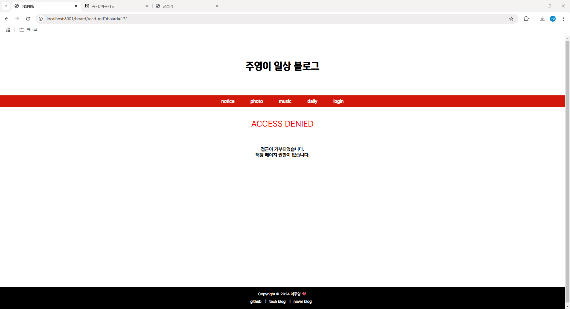 익명 사용자가 주소창에서 비공개 글 상세보기 url을 호출할 경우에는 AccessDeniedException 예외를 던지고 해당 예외를 잡은 catch문에서 access-denied 페이지로 이동하게 끔만 해놨다. 바로 예외를 던져버리기 때문에 데이터를 받아 보내진 않지만 해당 방법은 좋은 방법은 아닌 것 같고 다른 방법을 찾아봐야 할 듯 하다. 레퍼런스 안찾아봐서 아직 잘 모름..