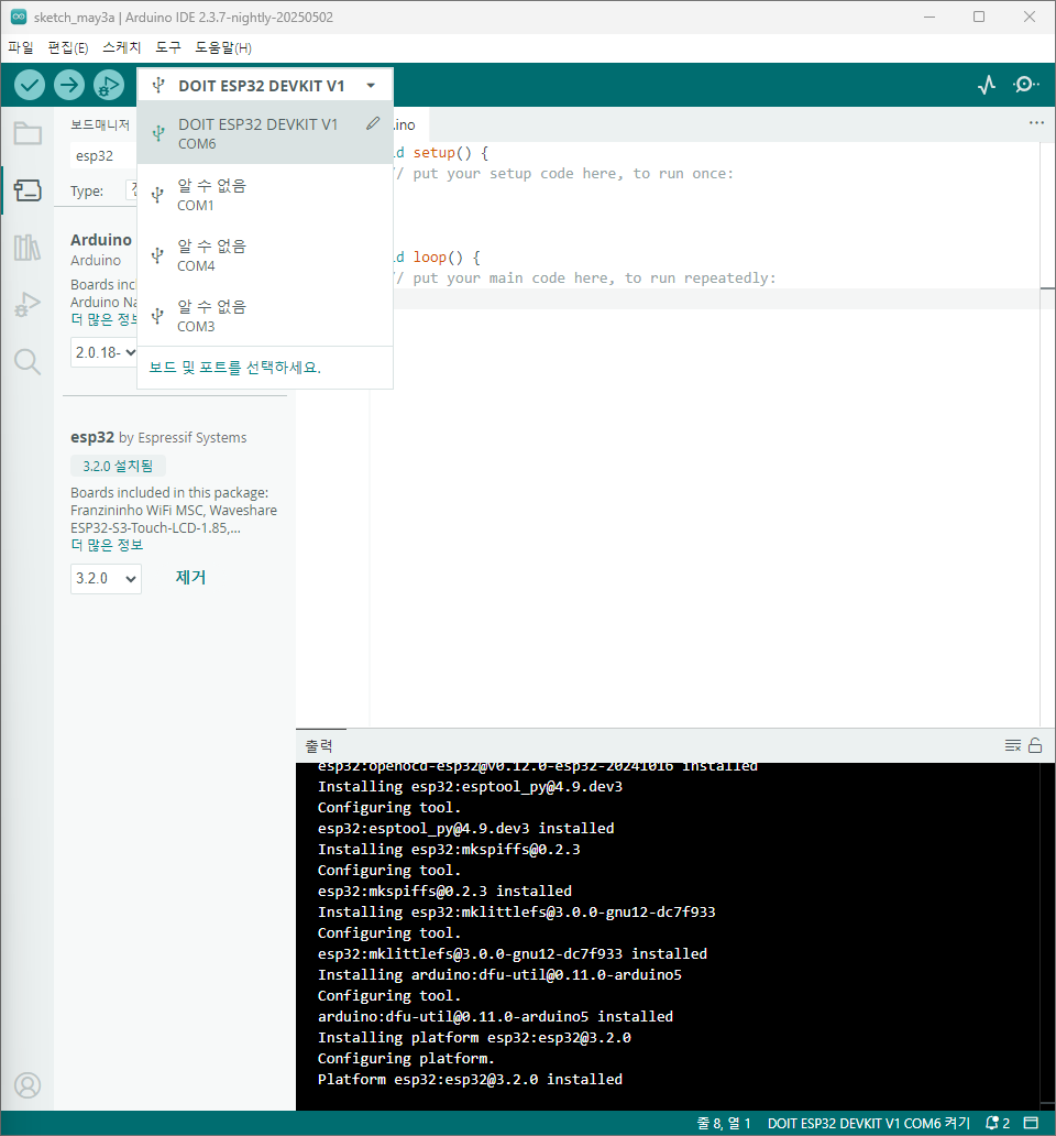 온습도 센서 모듈, ESP32 확장 보드, 브레드보드(빵판)을 사용하여 테스트를 진행했다. 온습도 센서 모듈ESP32 확장 보드GNDGNDDATAD18VCC3V3 라이브러리 다운로드DHT sensor libraryAdafruit Unified Sensor #include #define DHT_PIN 18#define DHT_TYPE DHT11DHT dht(DHT_PIN, DHT_TYPE);void setup() { Serial.begin(115200); dht.begin();}void loop() { delay(2000); // 2초마다 센서 값 읽기 float temperature = dht.readTemperature(); // 온도 float humidity = dht.readHumidi..