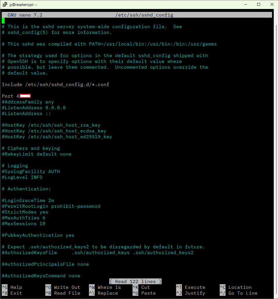 선수 작업1. SD 카드에 라즈베리파이 이미져 설치2. 라즈베리파이랑 WIFI 공유기 LAN선 연결3. 전원 어댑터 연결4. …1. SSH 포트 변경일단 putty 같은 SSH 원격 접속 프로그램으로 라즈베리파이 내부에 접속한다. ssh 관련 설정 파일을 건드리자. 왜 건드리느냐. ssh 접속 기본 포트인 22는 기본적으로 사용되는 포트이기 때문에 보안에 취약하다. 바꿔주자. jy@raspberrypi:~ $ sudo nano /etc/ssh/sshd_config 나는 이미 수정을 해놔서 주석 처리가 없는데 원래 처음 들어오면 주석 처리가 되어있다. 앞에 ‘#’을 지우고 원하는 포트 번호로 수정해주자. nano로 작업하는거라면 ‘Ctrl + O’로 저장 후 ‘Ctrl + X’로 빠져나올 수 있다. 그리..